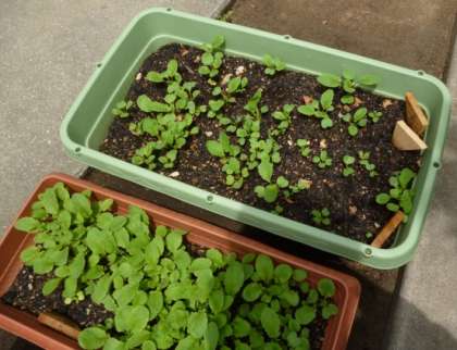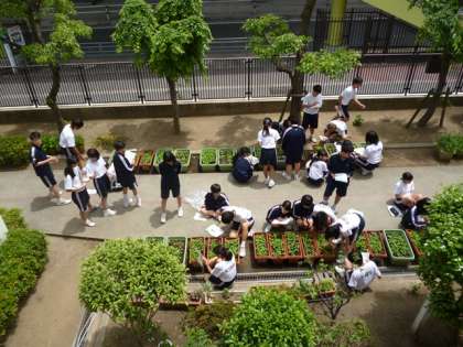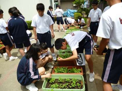 5月17日(水)2年生の技術で「栽培実習」を行っています。今日は「間引き」をして、発育をそろえるために、品質の良いはつか大根の苗を残す作業をしました。観察記録をつけ、成長を見守っています。