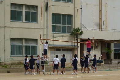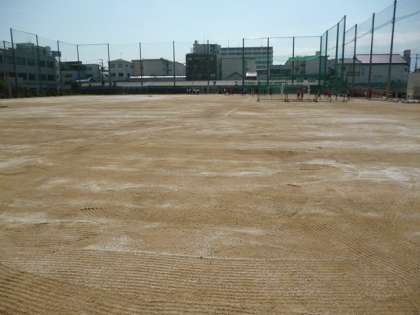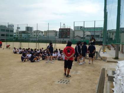 5月17日(水)放課後、運動場に運動クラブ員が集まり、体育大会に向けて準備をしました。体育科の先生から説明を聞いた後、運動場に「にがり」をまきました。にがりを運動場にまくと、 グラウンドが適度に締まり砂ボコリが立つのを減らしてくれる効果があります。また、運動場の端では、ラグビーのポールを部員たちが協力して片づけました。