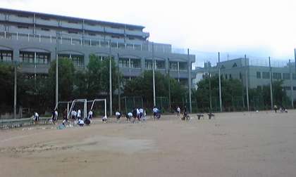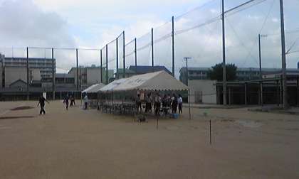 現在グラウンドを整備中です。体育大会は1時間遅れで実施予定。