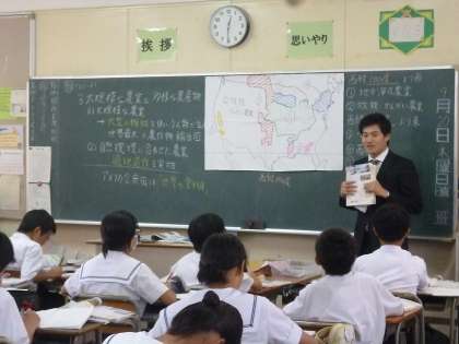 9月20日(木)教育実習生3人が「数学・社会・英語」の研究授業を行いました。1年数学では「一次方程式の利用」で文章を読み、自分で方程式を立式して解く授業を業を行いました。1年社会では、手作りの世界地図(北アメリカ)を活用し「大規模な農業と多様な農産物」について授業を行いました。後半身近な話題にふれ、生徒たちから積極的な発言がありました。2年英語では、前半フラッシュカードで単語を確認し、その後「must not」を使って英文を完成させる授業を行いました。明日も最後の1人が、研究授業を行います。