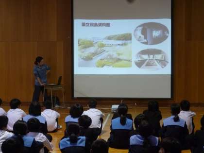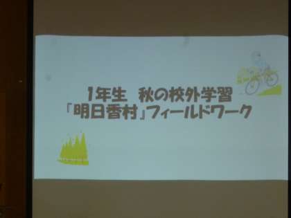 11月8日(木)格技室に1学年全クラスが集まり、校外学習の全体説明を行いました。担当者より、写真やイラストのスライドを使って、事前学習から当日の流れまで、説明を行い、最後に学年主任から全体に注意事項等の話がありました。今日からの流れは次の通りです。