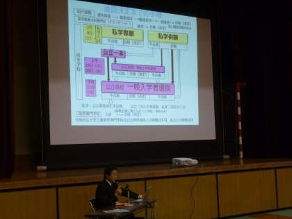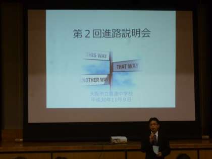 11月9日(金)放課後15時より、全学年保護者向けの第2回進路説明会を体育館で実施しました。校長の挨拶の後、進路指導主事よりパワーポイントのスライドを50枚以上使って説明しました。説明の内容は次の通りです。