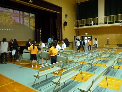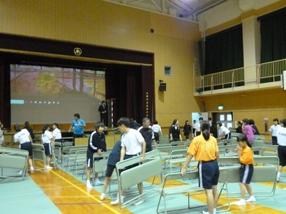 体育館で進路説明会が終わった後は、平常通りの部活動があります。体育館利用のクラブ員が多数集まり、短時間で集中して、舞台下のスペースにイスやシートを運び入れました。喜連中学校では、毎日放課後、活発に部活動が行われています。