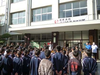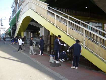 部活動(野球・ハンドボール・ソフトテニス・男子バスケットボール・剣道・ラグビー)生徒と保護者、教職員を合わせて約130名の参加で、学校外回りと校内正門付近などの清掃活動を実施しました。PTA代表挨拶(写真上)、学校北側(写真中)、正門前歩道橋(写真下)の様子です。