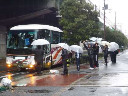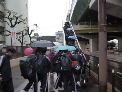 2年生は、ピロティーで出発式を行った後、1年・3年の先生たちに見送られ、長野県白樺湖方面にスキーの修学旅行に出発しました。