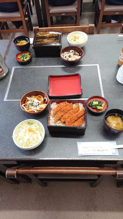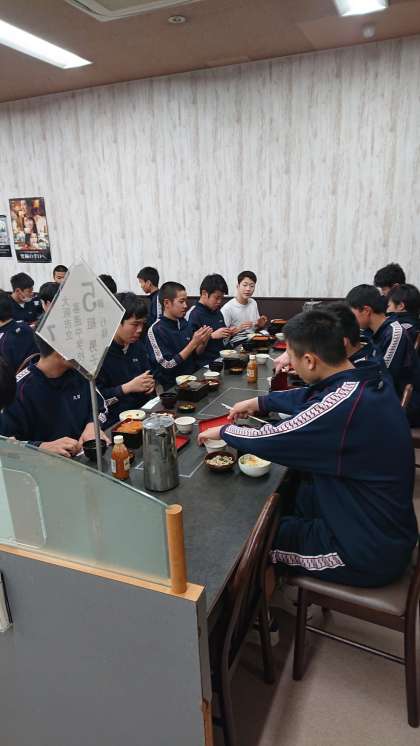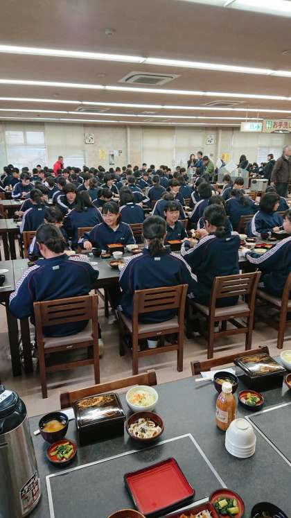 予定通り駒ヶ岳で一度高速道路を降りて、昼食場所に到着。昼食は、生徒代表の「いただきます!」の合図で、ソースかつ飯(写真中央)をいただきました。これから予定通りバスに乗ってスキー場に向かいます。