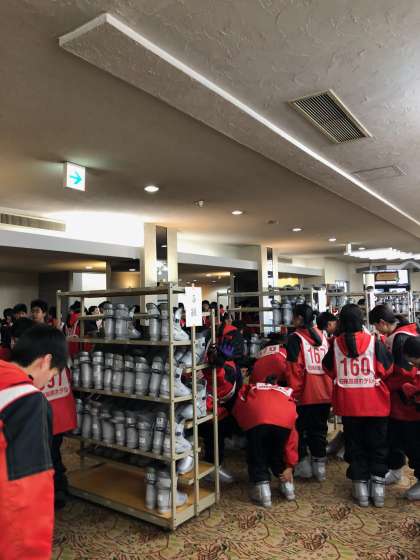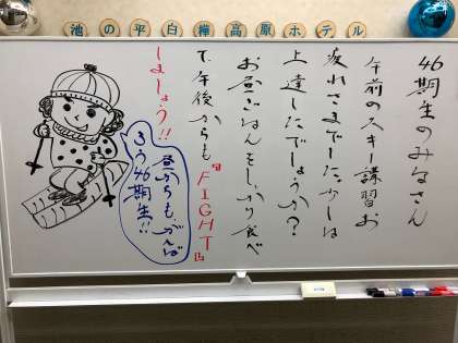 午前中の講習会が終了し、スキーブーツを脱げば、待望のお昼ご飯「カレーライス」です。宿泊先のホテルから、ホワイトボードには応援メッセージがありました。