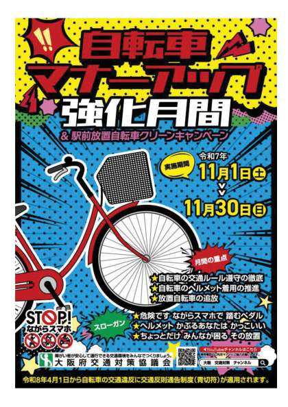 大阪府交通対策協議会及び市民局区政支援室地域安全担当課より案内があり、PRポスターを掲示し、児童生徒及び保護者のみなさまもに周知のうえ、交通安全教育の充実を推進を図りたいと思います。なお、自転車で来校する際のマナーには、大阪市ホームページにおいても公表しております。
