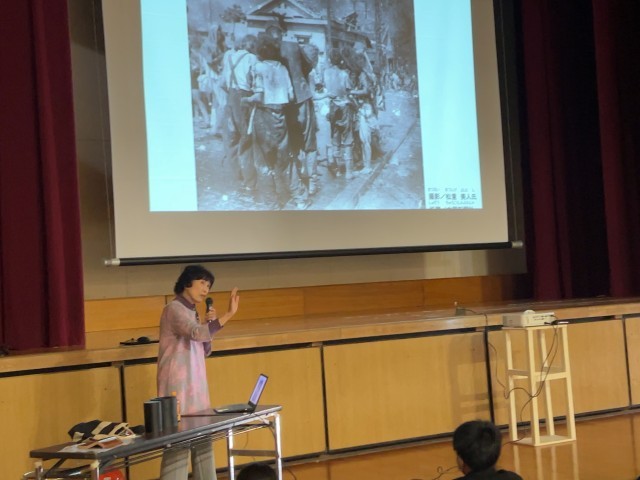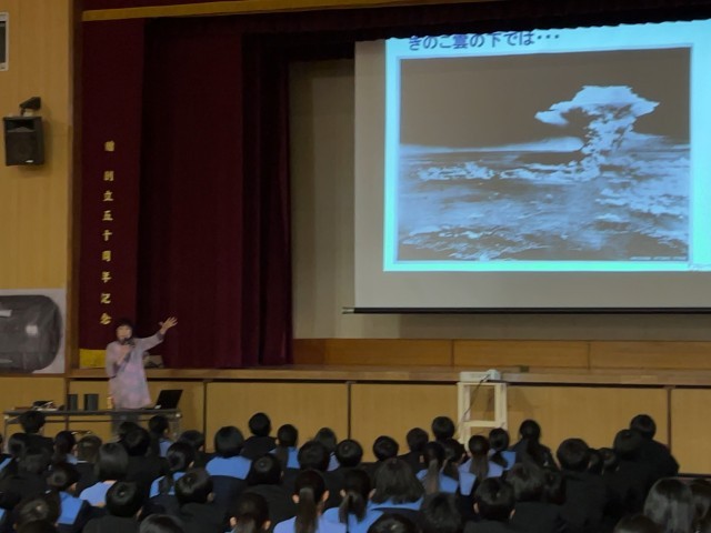 外部から講師の方をお招きして、原爆の被害や戦争によって起きた出来事を中心にお話をしていただきました。生徒たちは真剣にお話を聞いて取り組んでいました。