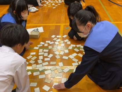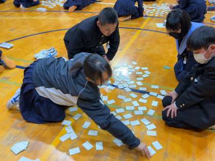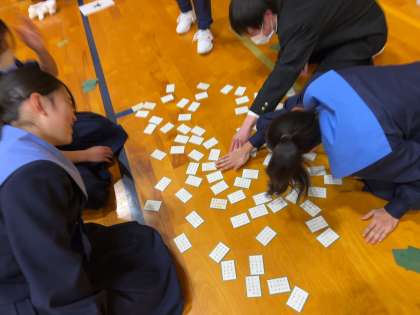 5、6時間目に体育館で1年生の百人一首大会が実施されました。これまで各クラスで練習を積み重ねた成果を存分に発揮していました。札を奪取する白熱したやり取りに、皆さん力が入っていました。