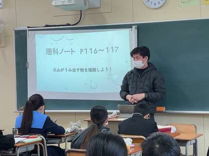 1年4組で理科の研究授業が行われて、火山活動と火成岩について学習しました。