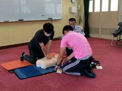 消防署の方に外部講師としてお越しいただき、心肺蘇生とAEDの使い方について学びました。そのあと、実際に人形を使って胸骨圧迫の練習をしたり、練習用のAEDを使って電源の入れ方、声掛けや安全確認、パッドの装着から電気ショック実施まで練習しました。 -