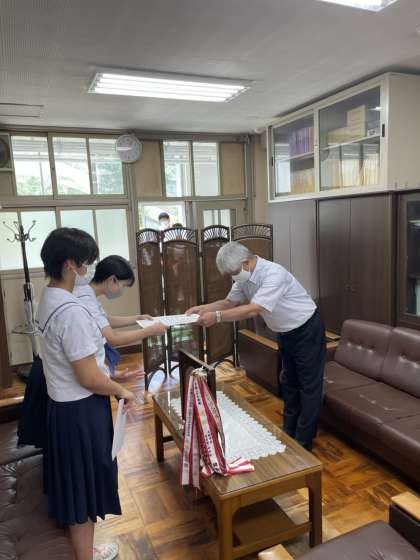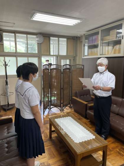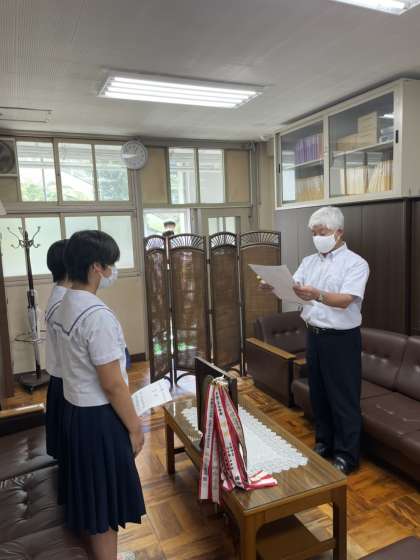 バドミントン部女子、ハンドボール部女子剣道部女子、ハンドボール部男子、社会を明るくする運動作文で女子に、賞状の伝達を行ないました。