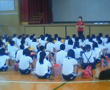 今日は長吉六反小学校と長吉東小学校の6年生のみなさんが体験授業、クラブ体験に来ました。体育館で今日の説明を受けています。