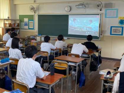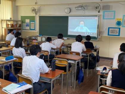 代表者が校長先生から認証状を受け取る様子を、全校生徒が各教室でモニター越しに見ていました。
