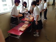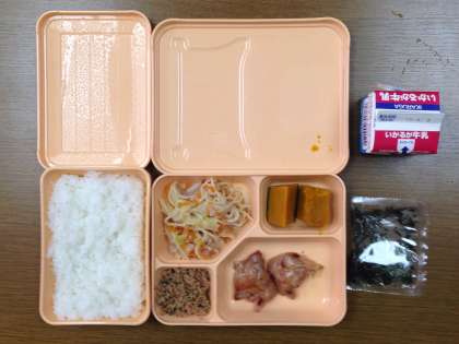 鶏肉の照り焼き、和風スパゲッティ、カボチャの煮物、鮭菜っ葉そぼろ(ふりかけ)