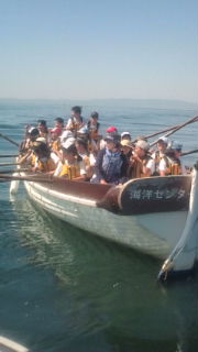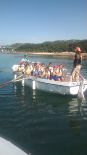 十数人、あるいは二十数人で1艇のカッターに乗りこみ、全員で協力して、オール漕ぎをします。