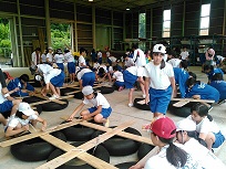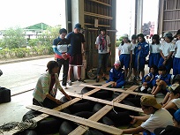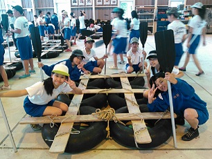 2日目の海の活動は、班ごとに「いかだ」をつくり、その「いかだ」に乗って海に出ます。