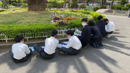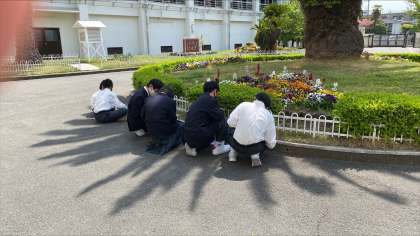 本日晴天のもと、1年生は教室を出て、校内の植物を観察しました。