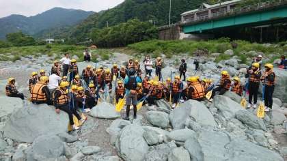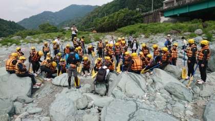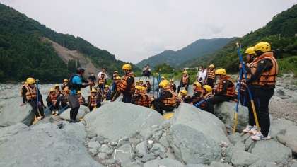 ラフティング会場に到着し準備を整え、出発前の説明を聞いています。
