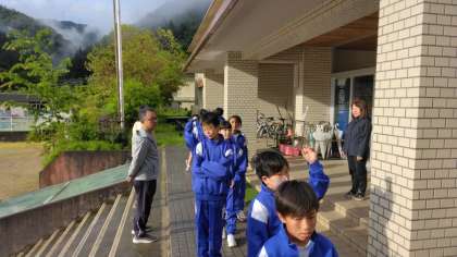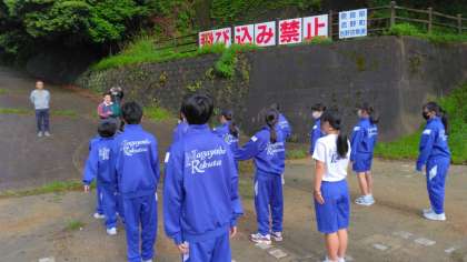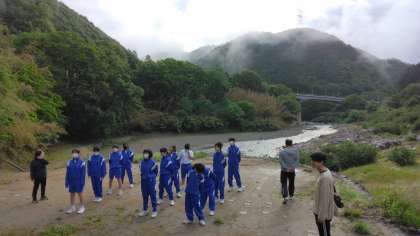 吉野川の河原まで歩き、元気にラジオ体操をしました。
