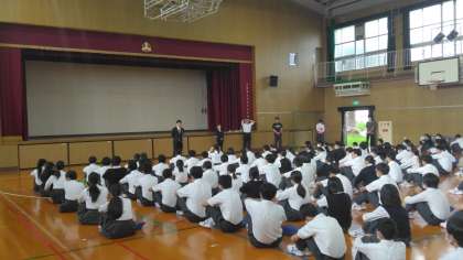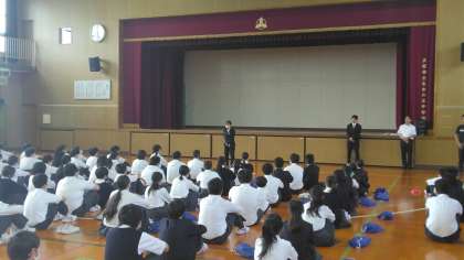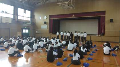 文化祭の有志募集の連絡、ハンドボール部の表彰の後、教育実習生からお別れのあいさつがありました。