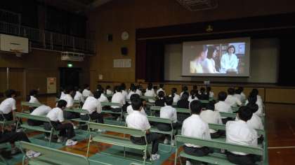 教材ビデオを見て、先生の解説を聞き、ワークシートに学んだことや自分の考えを書きます。