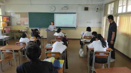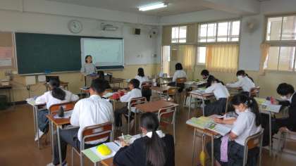 1年生は教科書と、プロジェクターを活用し、南アジアの産業を学習しています。