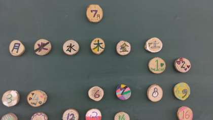 教室のうしろの黒板には、吉野宮滝で生徒自身が作った木工細工のカレンダーがあります。
