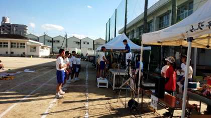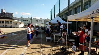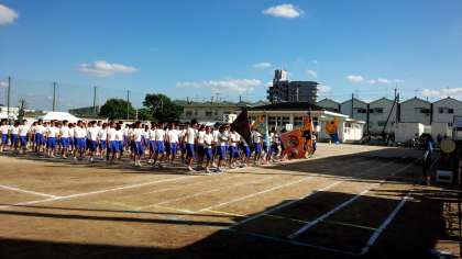 写真の中央、右は行進の部で最優秀賞(2年1組、2年2組)