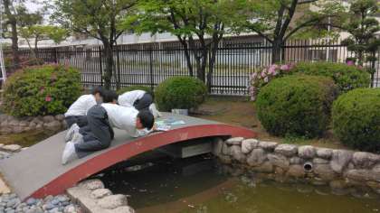 理科の先生の立ち合いのもと、普段は立ち入ることのできない六反川の橋の上からの自然観察もしています。