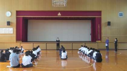 3年生の学年集会では、2人の教育実習生からお話がありました。