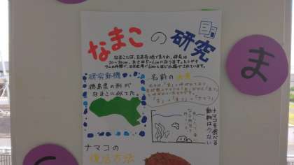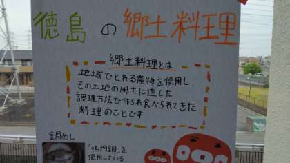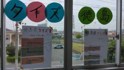 3年生の廊下には、生徒たちが自分でつくった徳島県にちなんだクイズがはってあります。