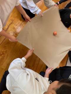 息を合わせて布の上でリフティングします。