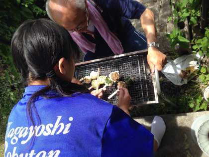 クルミやタケノコなどを収穫した後、クルミなどを使っての五平餅づくりです。