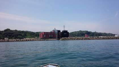 沖から見た、海洋センターです。(向かって左側が宿泊棟です。)