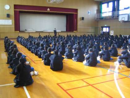 続いて、体育館に全員集合して、終業式を行いました。(写真左)