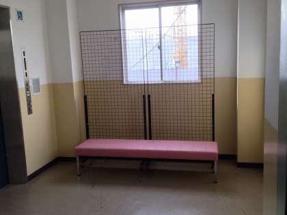 既存の展示ケースの移動設置や、新たな掲示パネルやベンチ(写真)を設置し