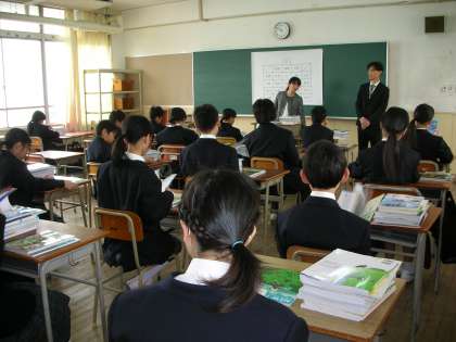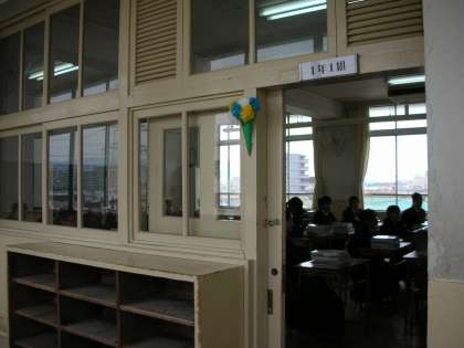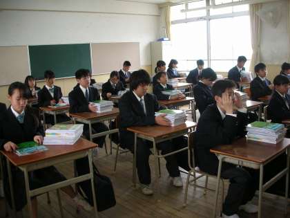 体育館での入学式が終わった新入生は、4階の教室に上がって初めての学級活動です。担任の先生のあいさつの後、教科書を配布してもらいます。