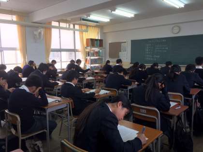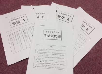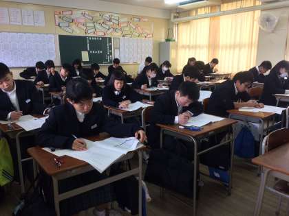 今年度は、「国語A」「国語B」「数学A」「数学B」「生徒質問紙」を、5時限目まで実施します。2教科に関する調査では、3年生になって初めて取り組むテストとあって、主として知識に関するA問題や活用に関するB問題にも、最後まで集中して問題と向き合っていました。