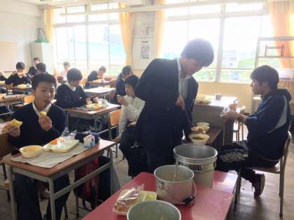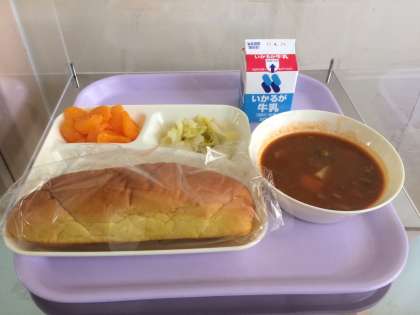 今日の給食はビーフシチューです。キャベツのピクルスとみかんの缶詰にパンプキンパンがつきます。