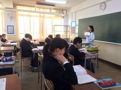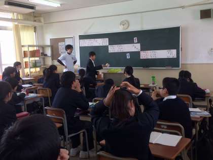 左は2年2組の英語の授業。フラッシュカードを使い、単語の意味と発音の学習です。発音の声がちょっと小さく自信なさげなひとが多いような…