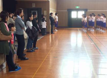 1年1・2組は合同で体育館で集団行動の練習です。きびきびとした美しい動きを、だくさんの保護者の皆さんに見ていただきました。