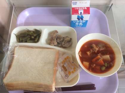 ケチャップ煮は、豚肉とじゃがいも、玉ねぎ、にんじん、むき枝豆と具だくさんで、生徒が好みそうな味付けでした。