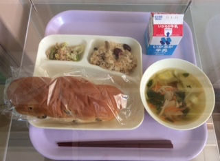 金時豆の中華おこわ、中華スープ、ツナと野菜のオイスターソース炒め、レーズンパンです。