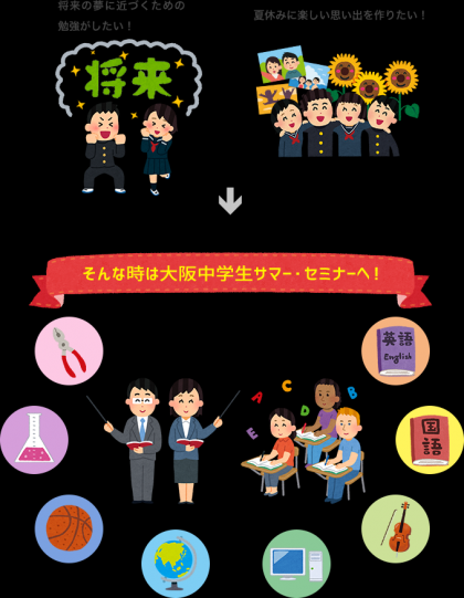 大阪の大学(団体)が、中学校の夏休み期間中に楽しい1日〜2日間の講座を開講します。