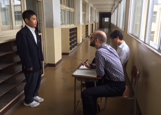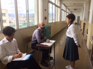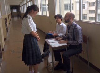 一人ひとり廊下に出てスピーキングのテストです。