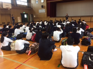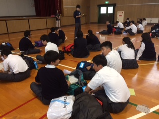 5・6限、3年生は体育館で修学旅行の事前指導です。