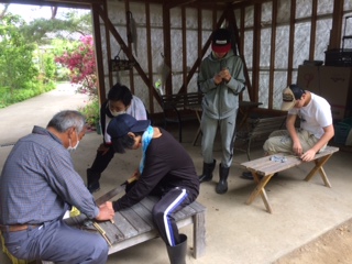 自分たちで切ってきた竹を使って紙鉄砲づくりを教わっています。紙の玉の詰め方にコツがいりますが、うまくいくとパンという音とともに勢いよく玉が飛び出します。