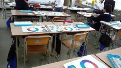 1年1組は、美術で色彩に取り組んでいます。出来あがった作品は、
